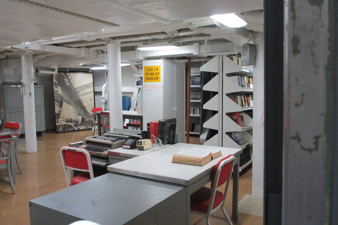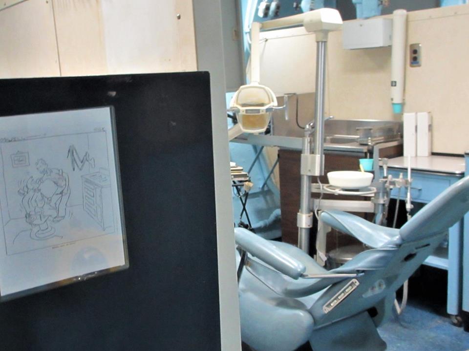 居住スペースには図書館もあります。郵便局もあります。艦内には歯医者さんもあります。揺れる中での治療は怖かったという漫画が貼ってありました。