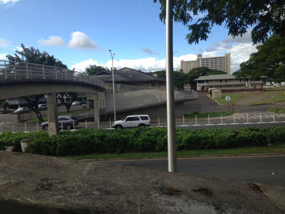 スマホで調べ、いいのか?これで?と不安になりながらも、パリハイウェイを越えて、その先の細い道にあるバス停に向かいます。結果的には正解でした。こんな歩道橋を渡ったり、初めての体験は楽しかった。