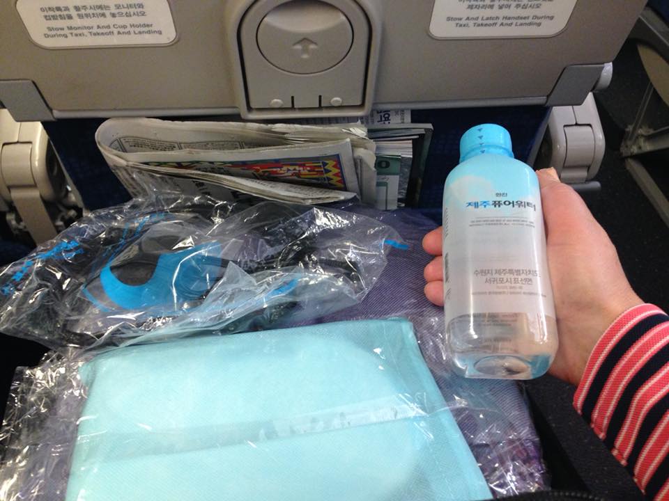各シートには毛布と枕が。お水、スリッパ、歯ブラシも付いてます。もちろんヘッドフォンも配られました。
