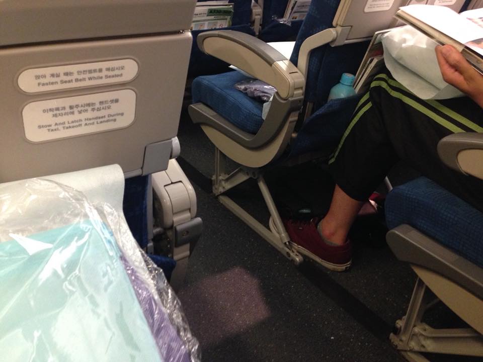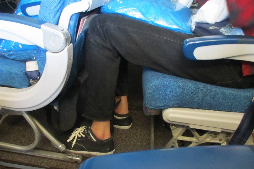 帰りはエコノミーです。この狭さ!足の長い息子は1ミリも隙間がない。