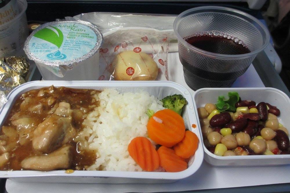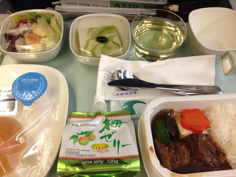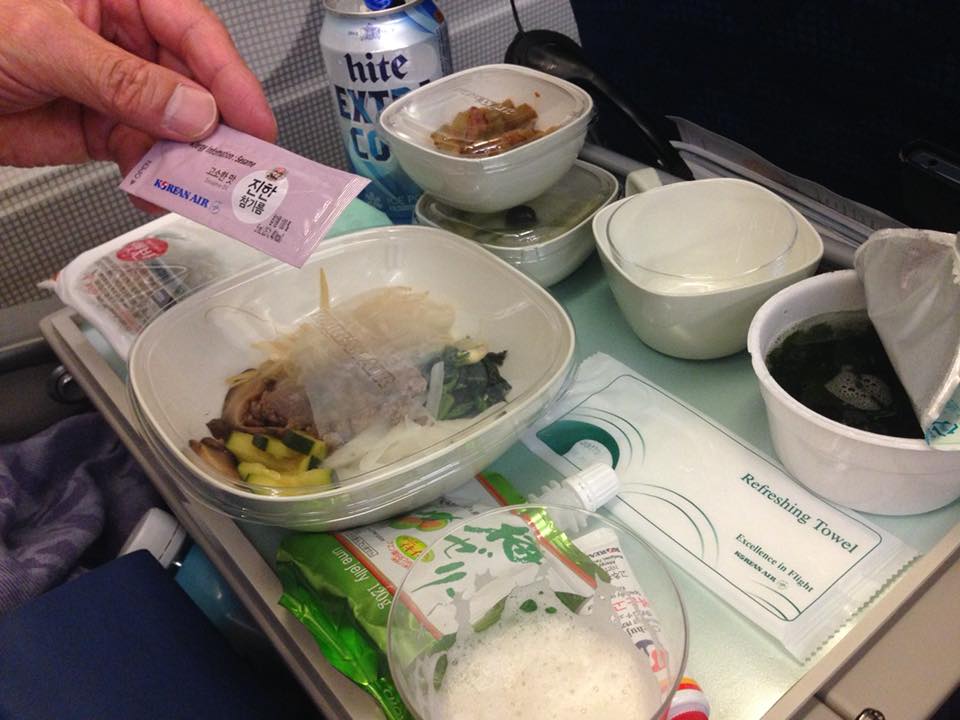 離陸して1時間ほどで一回目の機内食。なんと、エコノミーなのに、ビーフ、チキン、ビビンバの三種類から好きなものを選べます。私はビーフにしました。飲み物は白ワイン。