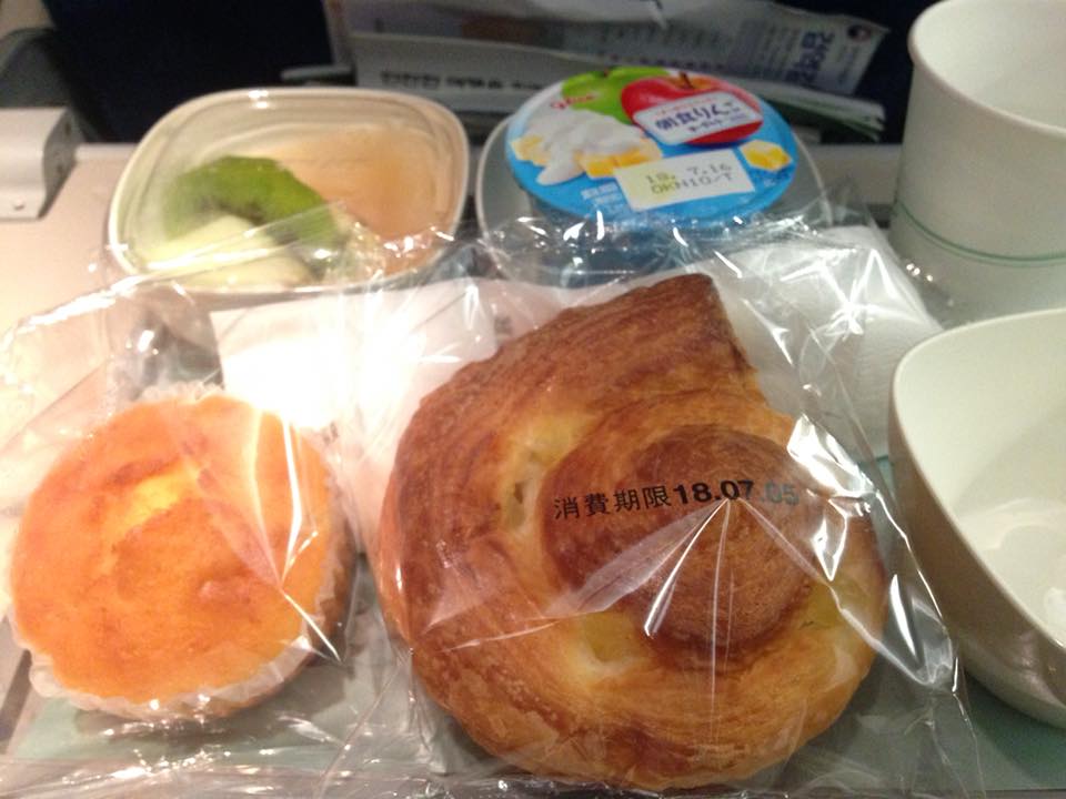 二回目の機内食はパンとカップケーキとフルーツ、リンゴのヨーグルト。あとからコーヒーもいただきました。