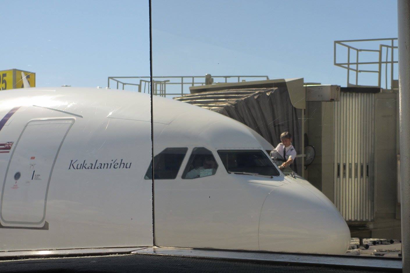 ロビーでこれから乗る飛行機を見ていたらパイロットがひょいと窓から身体を外に出し、窓を拭き始めました。こんなことができるの?ビックリ!