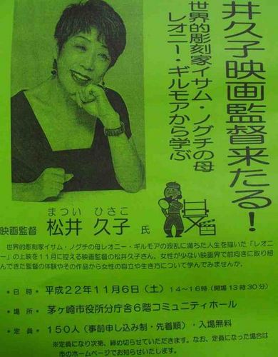 6日、茅ヶ崎で行われた松井久子氏の講演会に行きました。松井さんは、彫刻家イサム・ノグチの母 レオニー・ギルモアの半生を描いた日米合作映画「レオニー」の監督さんです。講演会のテーマは「人生は一度きり、あなたはどう生きますか」。