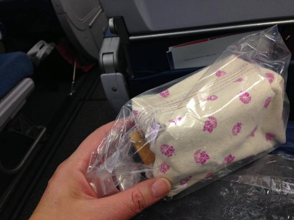 イヤホンやアイマスク、歯ブラシ、櫛、化粧水などが入ったこういうポーチが配られます。