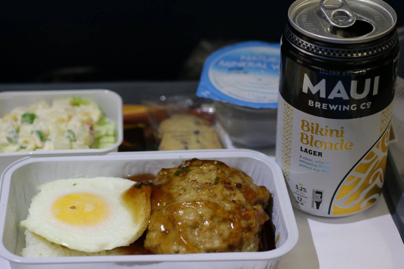 機内食はロコモコとポテトサラダ。ドリンクはハワイのビールをいただきました。