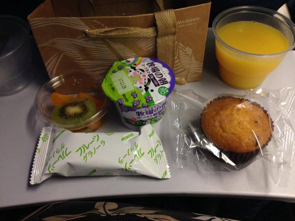 到着1時間前くらいに出される軽食は、グラノーラーとマフィン、ヨーグルト、フルーツ。ドリンクはオレンジジュースにしました。