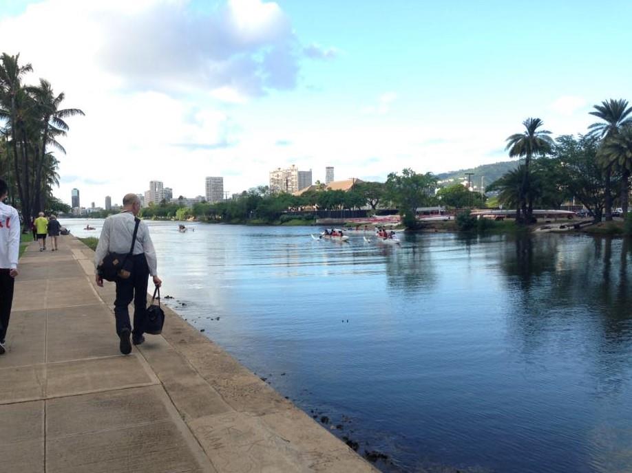 運河ではハワイ大学の学生さんたちがアウトリガーカヌーの練習をしていました。