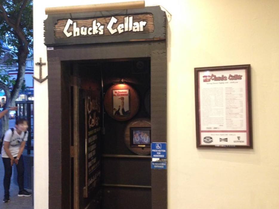 夕飯はホテルから歩いてすぐのチャックスセラーへ。この入り口を入って階段を下りた地下にあります。