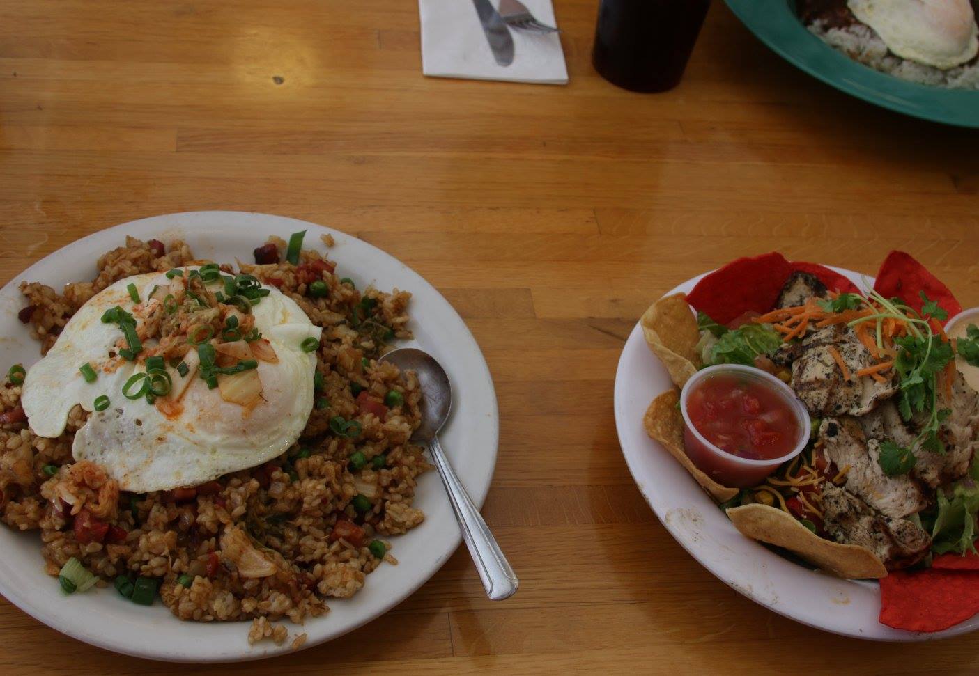 人気メニューのキムチチャーハン。具沢山で大盛り。網焼きチキンのサラダはスモールを選びましたが、笑っちゃうくらい多い。レギュラーサイズにしなくて良かった(笑)