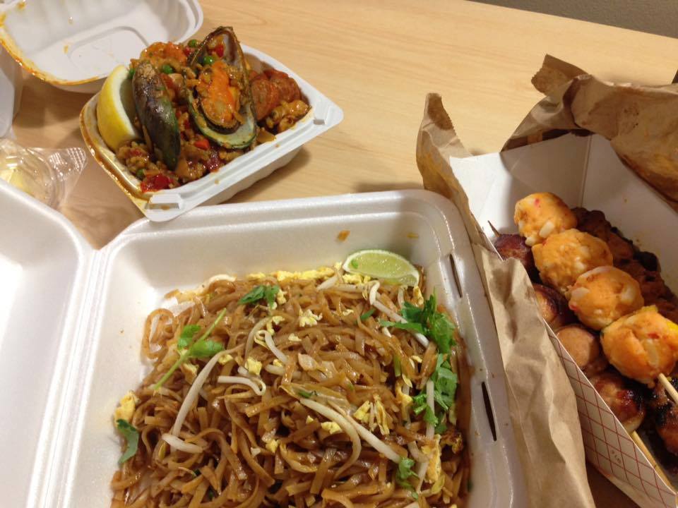 串焼き4本で5ドル。ハッタイ(タイ風焼きそば)11ドル。なかなかお買い得です。他のお店でパエリア、サラダ、フルーツなどを購入。