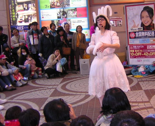 本厚木の駅を降りると、もう駅前にひとだかりができていて、そこで大道芸が繰り広げられています。ちょうど中国独楽で沸かせているところでした。
