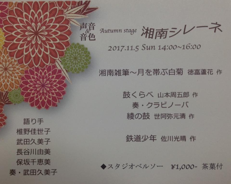 11月5日(日)、茅ヶ崎駅南口降りて、平塚方面に2~3分歩いたところにあるお洒落なサロン「スタジオベルソー」で、「声音&音色 湘南シレーネ」秋の公演を行います。