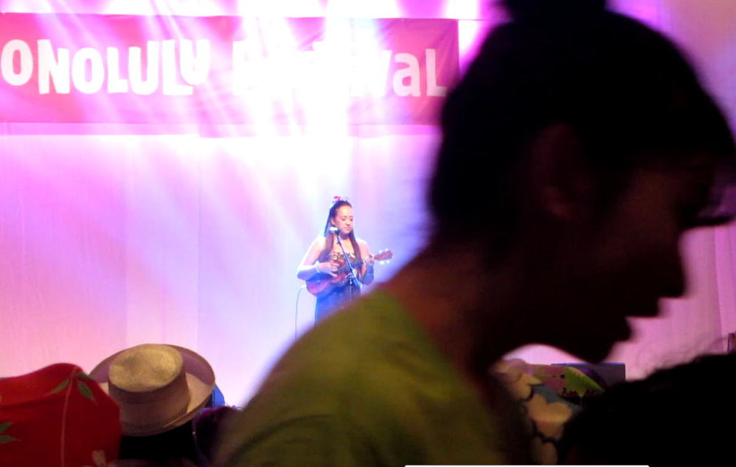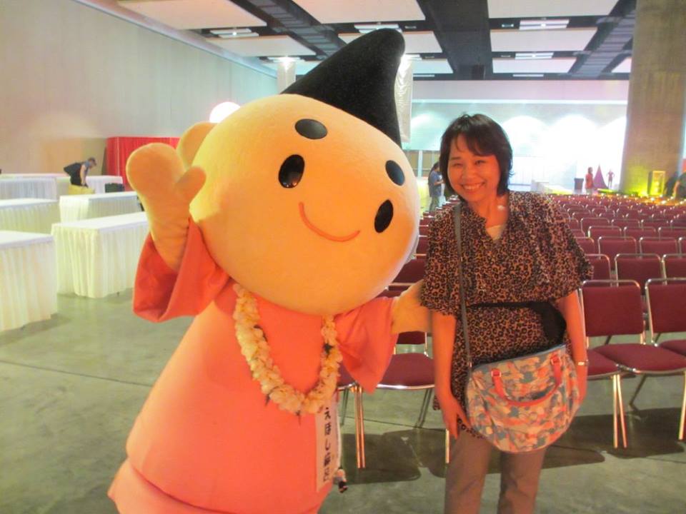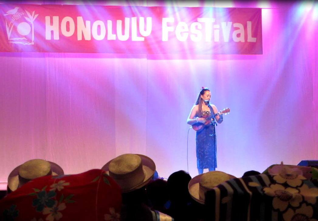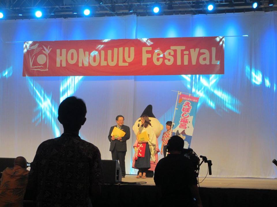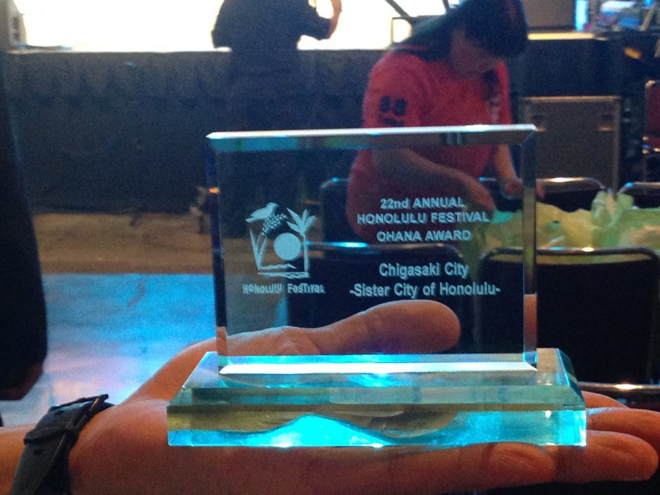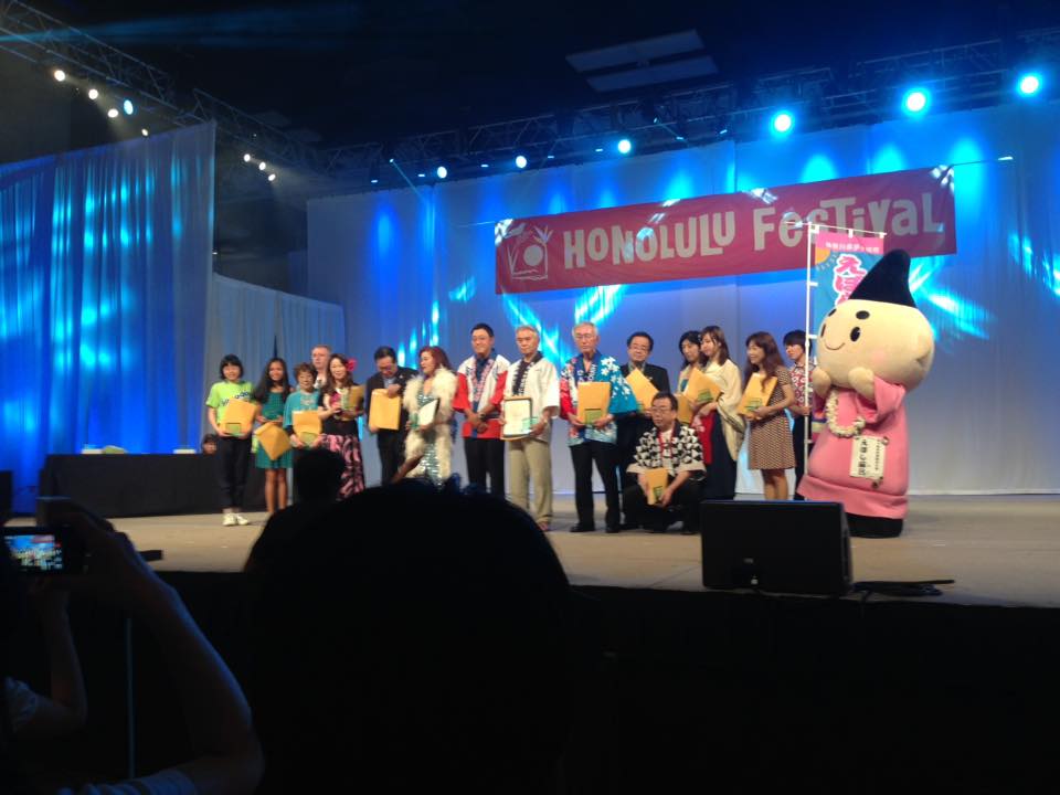ホノルルフェスティバルに三回以上参加している団体に「オハナアワード」が贈られました。麻呂くんは注目の的でしたよ。
