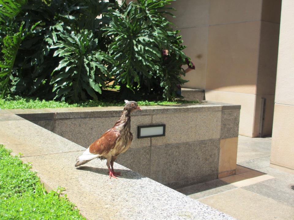 トロリー乗り場にて。ハワイのハトは日本のハトよりぐっと小顔です。