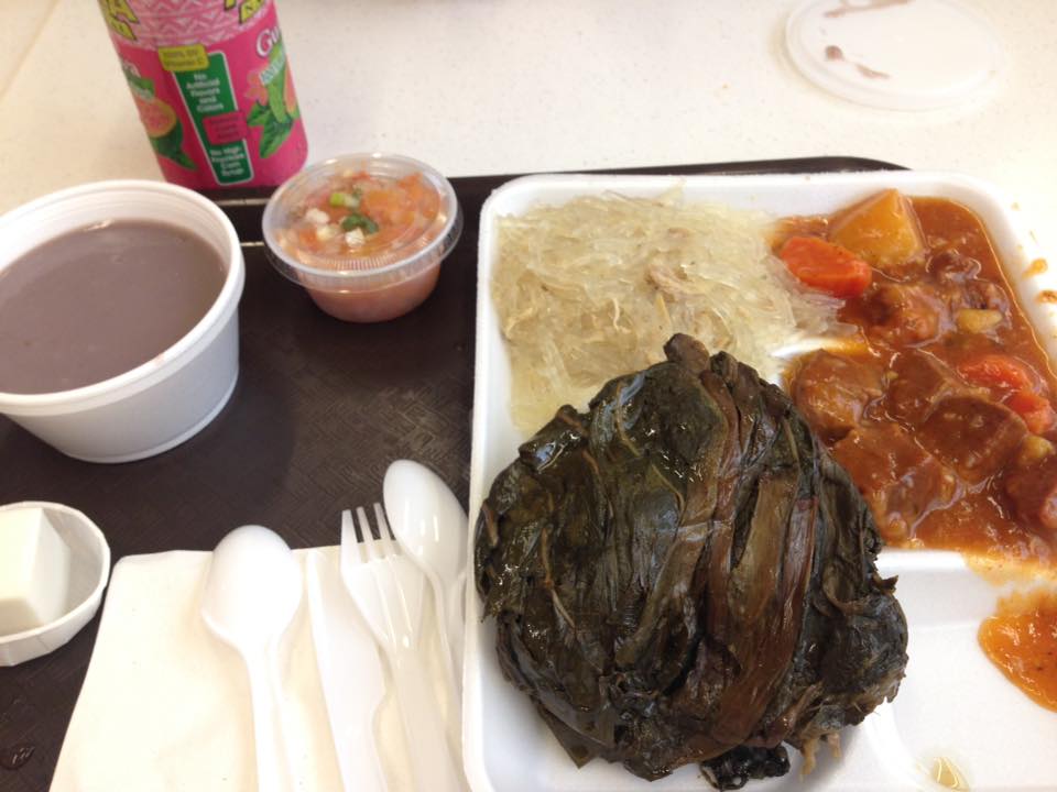 手前のキャベツを丸ごと煮たのかな?という姿をしているものは、タロイモの葉で豚肉を包んだ蒸し料理のカルアピッグ。切ると中からお肉が出てきます。葉っぱごといただきますが、とてもおいしかったです。左上の紫色のドロっとしたものは、タロイモをすすり潰して発酵させたポイ。すっぱいと聞いていましたが、本当にすっぱいです。知らなかったら、あれ?これ、痛んでる?って思うところでした。