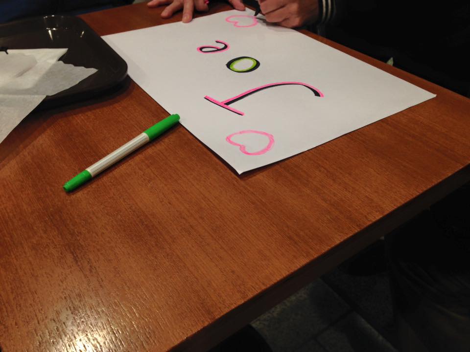 さっそくファン仲間と合流。当選葉書一枚で2名まで入場できます。座席指定券はひとりで4名分まで引き換え可能ということで、代表で何人かに並んでいただき、私たち数名で、下のカフェで応援グッズ作り。次々、101ファンの方がやってきます。2013年の「ステージ101復活コンサート」以来の方も多く、さながら同窓会のよう。