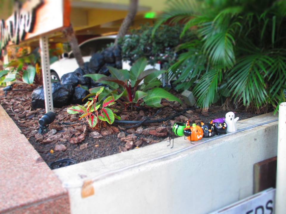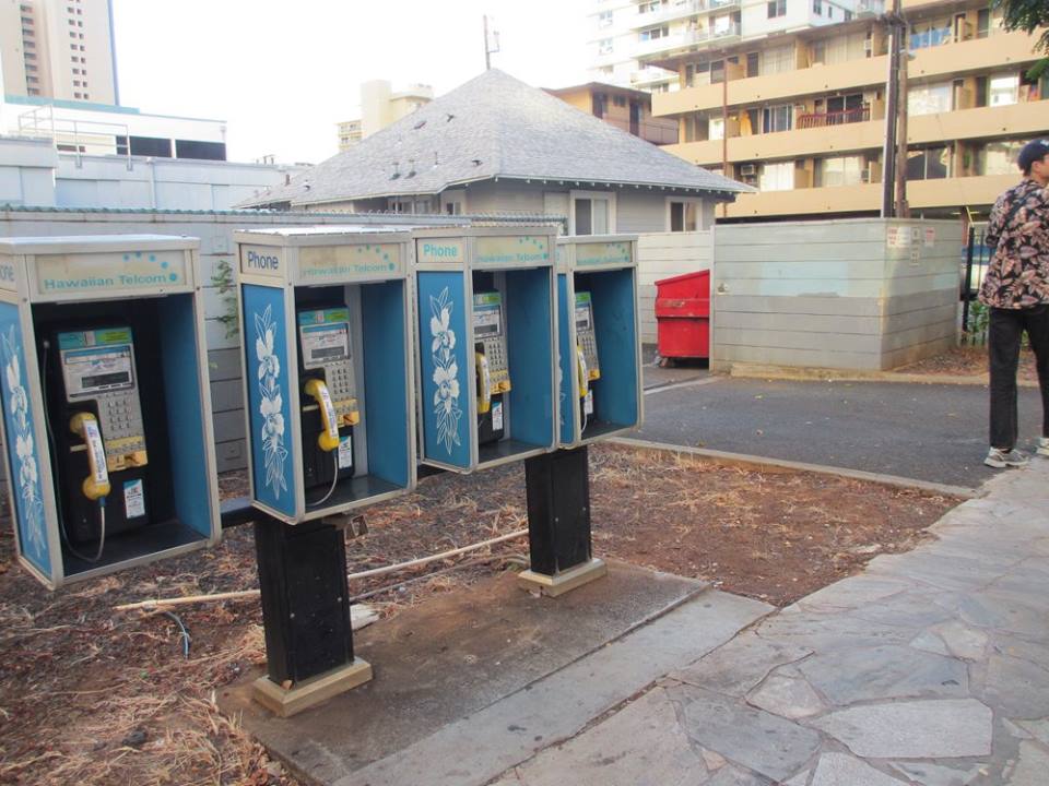 早朝のワイキキをお散歩。カラフルな清掃車とどこかのガレージのハロウィン飾りがアメリカっぽい。公衆電話は低い位置にあります。ドアもないので車椅子でも使いやすそう。