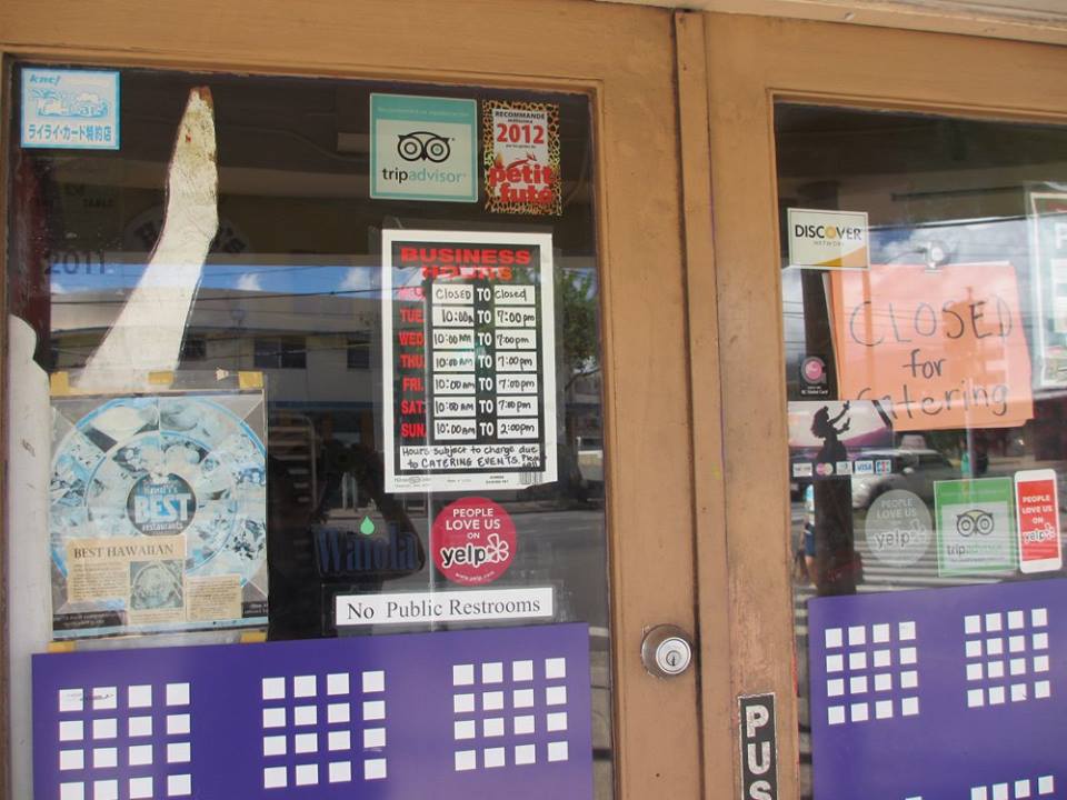 さて、そろそろ開店するころだと、オノハワイアンフードに戻ってみると、先にアメリカ人観光客らしきおじさん二人組みが待っていて「あと少しで開店だねー」みたいな話をしながらわくわく待っていたら、おじさんの一人が急に張り紙を指差して「今日は何日だ?」と聞く。