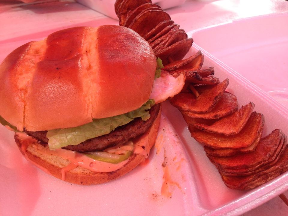 私はハンバーガーと串に刺した薄切りポテトフライのセット、レモネードつき。息子はまたしてもロコモコ。どうやらロコモコの食べ比べをしているみたい。