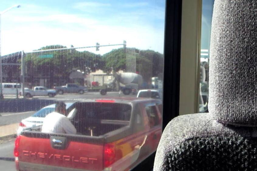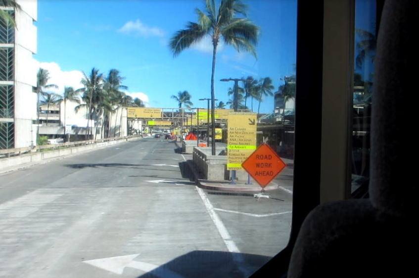 大型バスでいざホノルル空港へ。そうそう、ハワイって荷台に人が乗ってもOKなのですよね。こういうのをよく見かけました。
