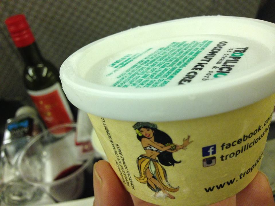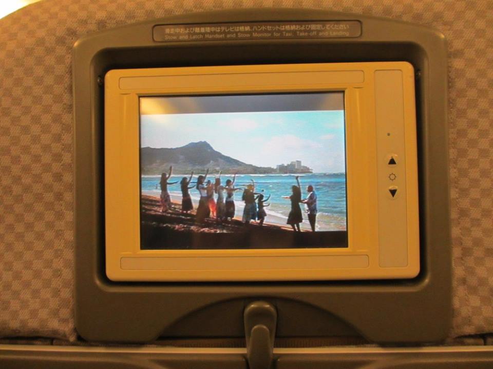 パーソナルモニターにはハワイの風景が映し出されています。「帰りたくな~い」と思ったけど、口に出してはいけない。去年、ここで口に出したら、本当に飛行機がホノルルに引き返してしまったのですから。
