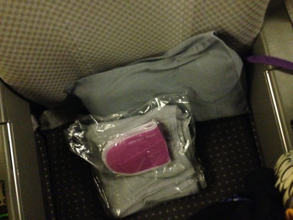 席には枕、スリッパ、毛布が置いてあります。スリッパは、青と黄色もあります。私は往復ともピンクでした。