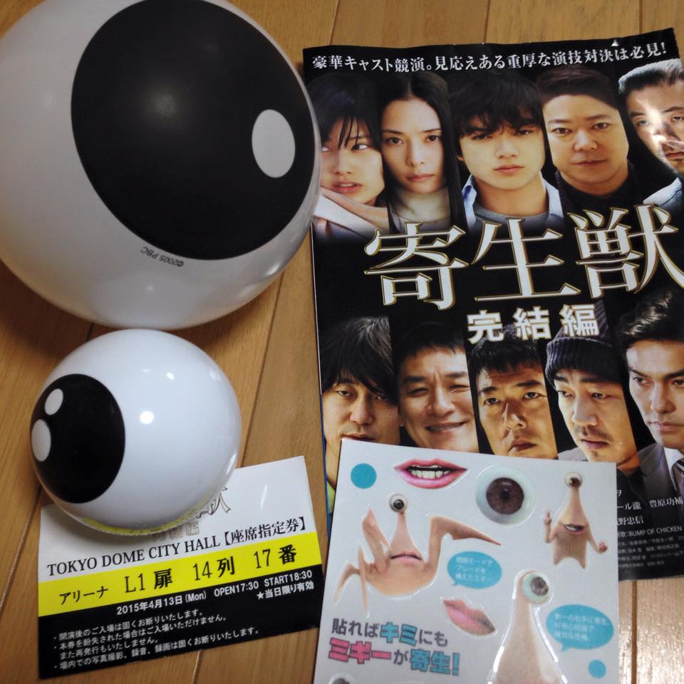 わ~。深津さんキレイ!顔ちっちゃ~い。ピエールさん、肌つやつや。なんて見とれていると、上からミギーの目玉の風船がたくさん降ってきて、おおーー!っと盛り上がり、気をとられていると、出演者が目玉のボールを投げ始め、そのひとつが膝の上にポンっと乗っかりました。ラッキー!運が良ければサインがついているかも?ということでしたが、残念ながらサインはありませんでした。
