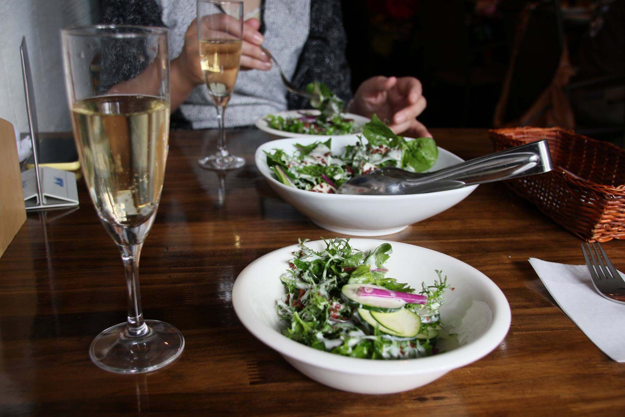 今日は、私の誕生日のお祝いも兼ねて、「ガーリックシュリンプ&パンケーキ食べ放題飲み放題つき」のメニューにスパークリングワインがあるのに気がついて、まずはスパークリングワインで乾杯。ガーリックシュリンプとパンケーキだけじゃ、中高年にはキツイので(笑)、サラダもオーダー。