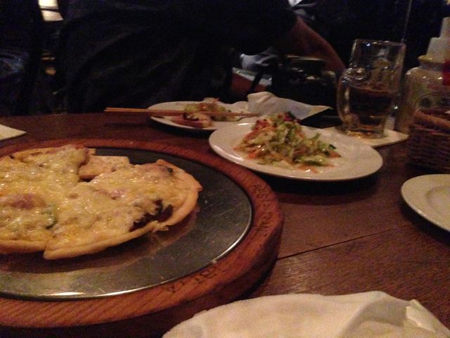 お店もてんてこ舞いで、オーダーするまで30分、飲み物が来るまで15分、お料理はさらにその1時間後という・・・。ピザの中からなぜかクラッカーが出てきたのもご愛嬌(笑)