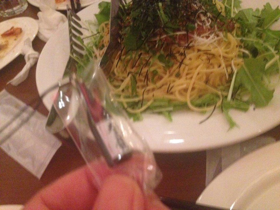 ねぎとろパスタ。手前のボケているのは、参加者がいただいた、日本酒「登龍」のストラップ。