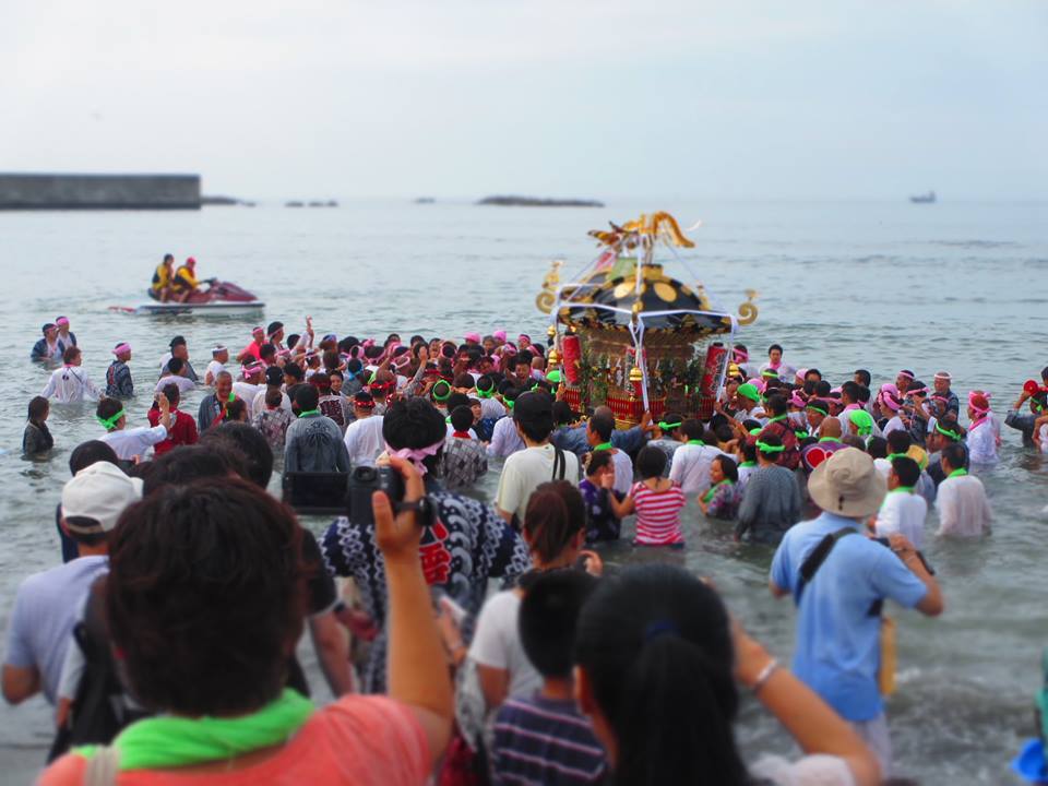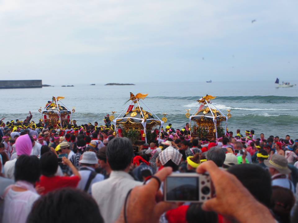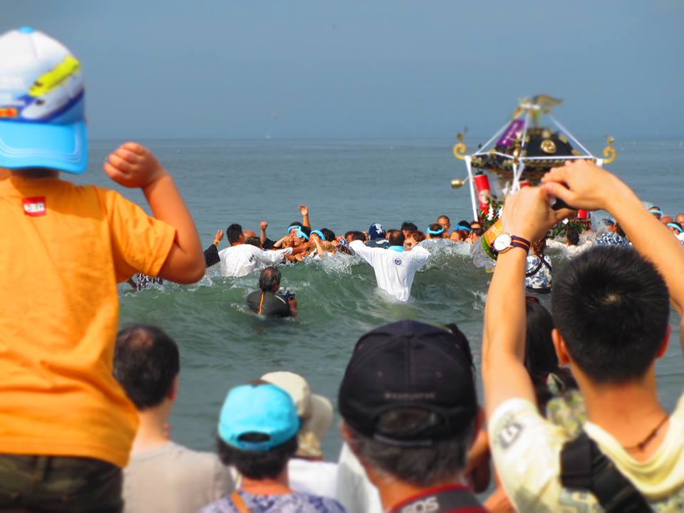お神輿が海に入って行う禊は、近くまで見に行き、ジーンズがびしょ濡れになりました。