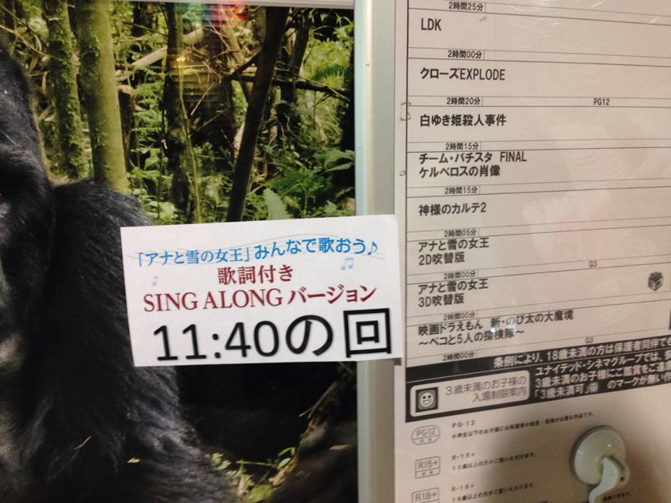 「アナと雪の女王」はすでに二回も観にいっていますが、GW限定で一緒に歌えるバージョンが上映されているとニュースで見て、あわてて調べ、近くにやっているところを見つけました。