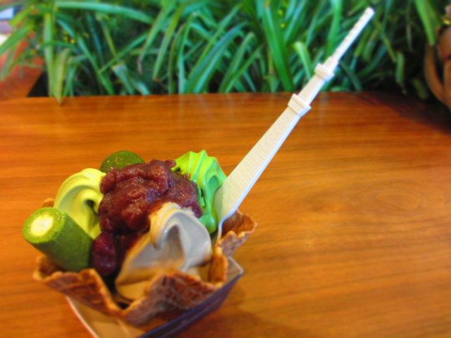 抹茶、ほうじ茶、玄米茶の三種類のソフトクリームが入っているのです。抹茶ソフトは珍しくないけど、ほうじ茶、玄米茶ソフトは初めて食べました。美味しかった~。スカイツリーの形のスプーンはお持ち帰り♪
