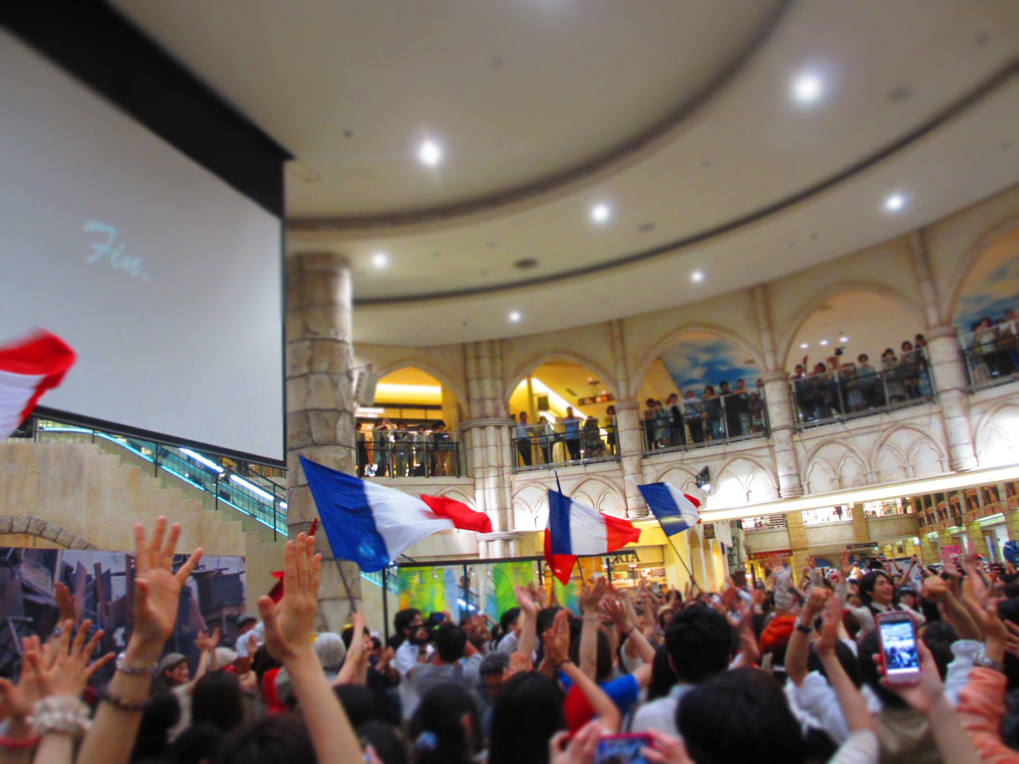 キャストの方が、前へ前へと背中を押してくれたので、わたしも群集の中に入って、ひらめくフランス国旗の下、こぶしを振り上げながら、大きな声で歌いました。