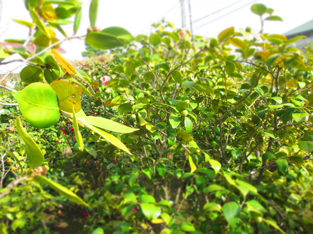 花の中にもうひとつ花が咲いているような花。菊の花のような細い花びらがびっしり中に詰まっているもの。それから、普通は椿の葉は、外側に反り返っていますが、内巻きカールになっているものがあって、これは杯のように水がたまったりするので『盃葉椿』というのだそうです。