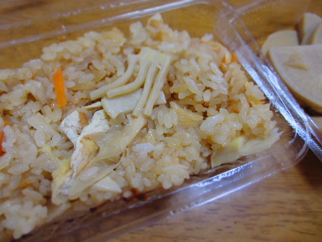 次の予定があったので、ピザはあきらめ、200円のタケノコご飯と100円のタケノコの煮つけを購入。