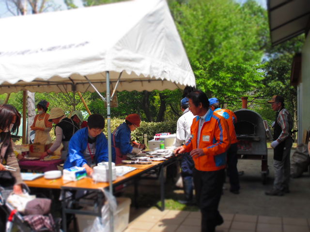 行ってみると、里山公園でとれた竹の子を使った料理の販売ブース。一番長~~い行列ができていたのは、タケノコピザ。