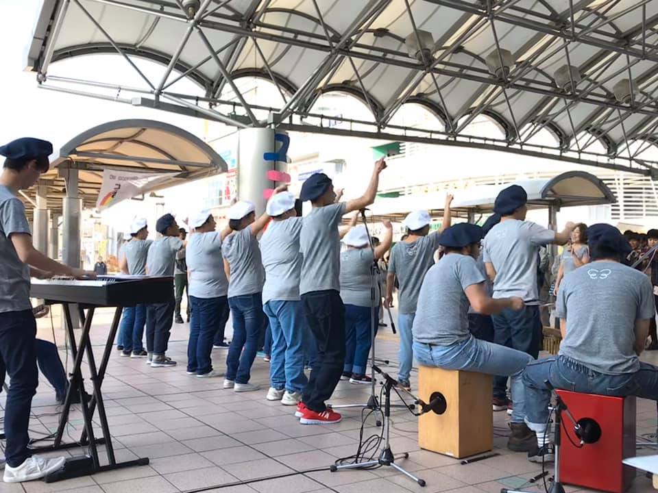 おそろいのグレーのTシャツはMusic of Mind。知的障がい者の音楽活動を中心とする自立支援施設で藤沢市大庭でライブカフェをやっているそうです。