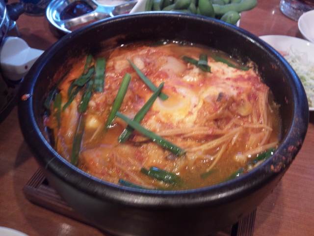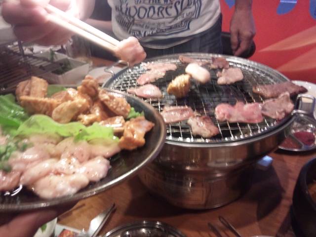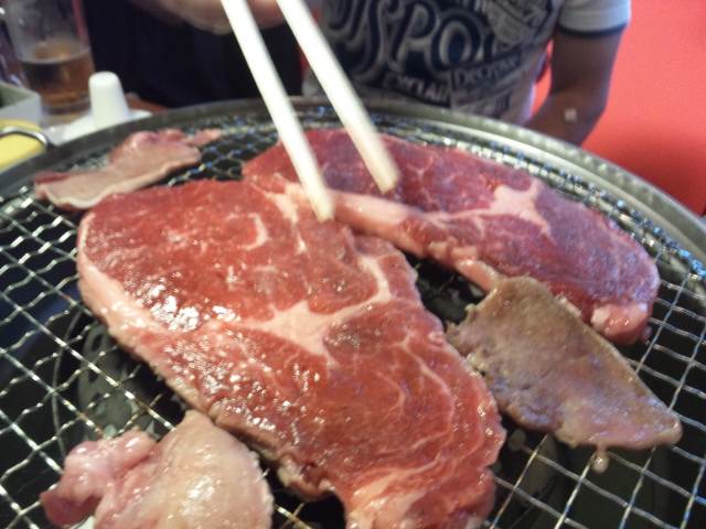 前菜やらおつまみやらサラダやらのあとに、タン塩、カルビ、ロースステーキと色々な種類のお肉が次々出てきて、合間にチゲ鍋も出てきて大忙し。(笑)