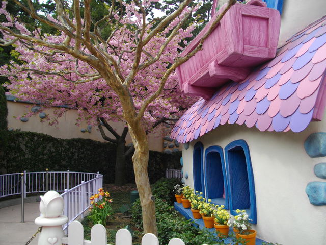 桜が散り始め、あたりはピンクの絨毯を敷き詰めたよう。その中にたたずむピンクの洋館は童話の世界そのもの。