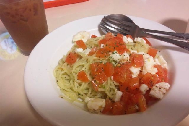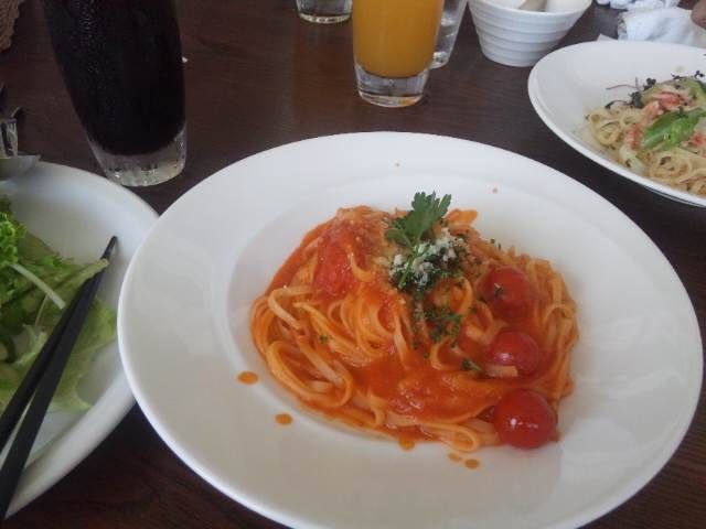 デパート梅屋の中にあるカフェ、ブラウンシュガーで、トマトとモッツァレラチーズのパスタを食べました。