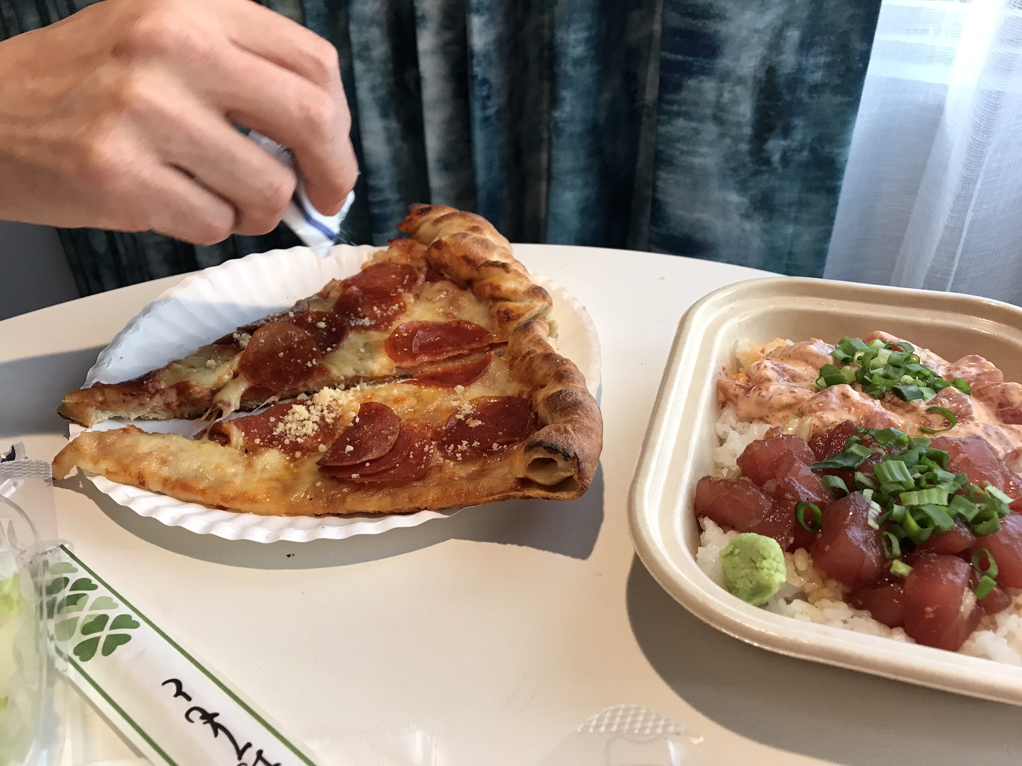 その後インターナショナル・マーケットプレイスのファーマーズ・マーケットを覗いてサラダとカットフルーツを購入、最後にホテルに隣接しているピザ屋さん「スライス オブ ワイキキ」のピザに寄って本日の夕飯が完成。二日目と三日目の夕飯は予約してあるので、テイクアウトメニューが食べられるのは初日しかないからです。