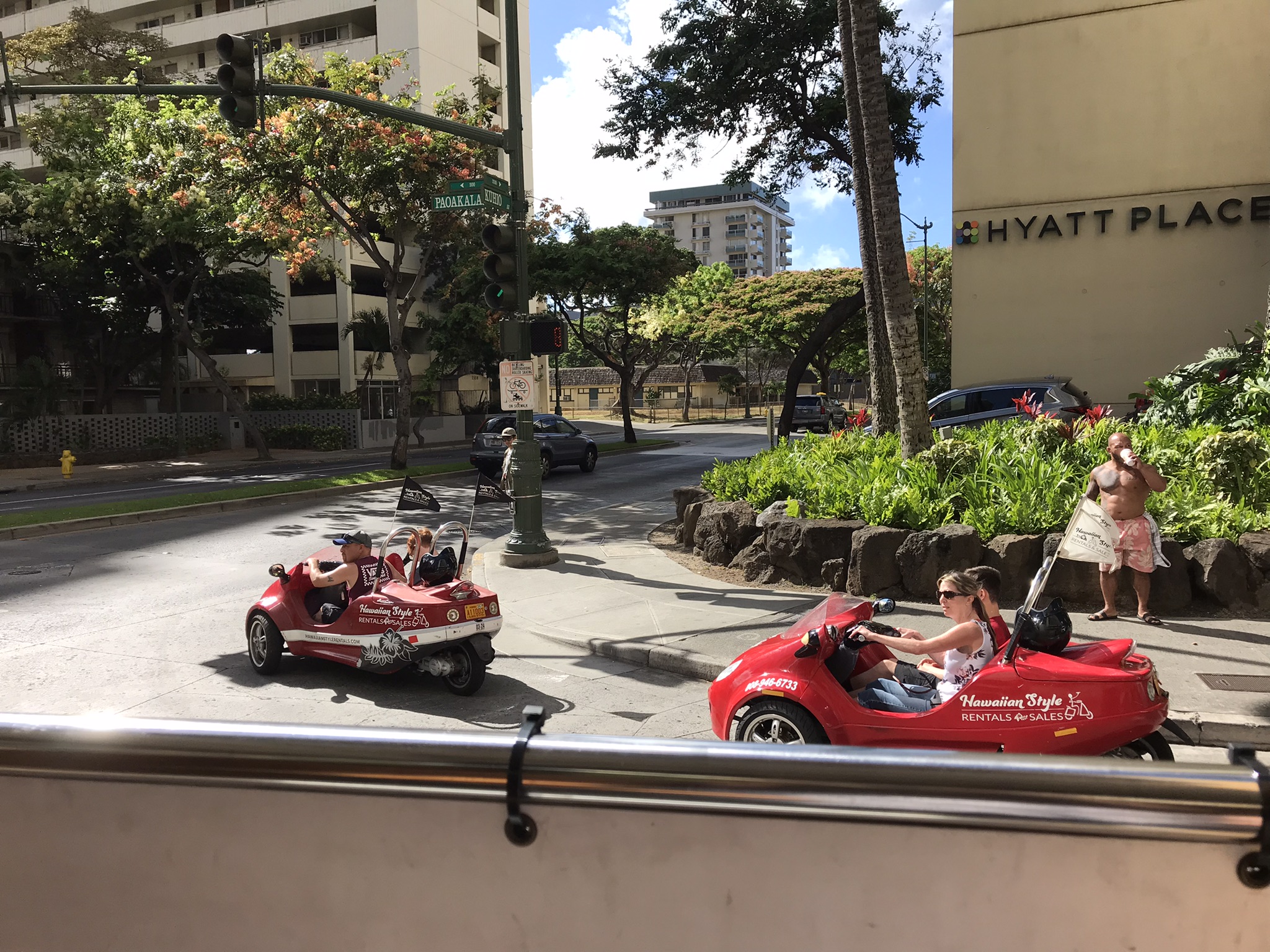 アメリカ人観光客らしき人々がカートではしゃいでいます。