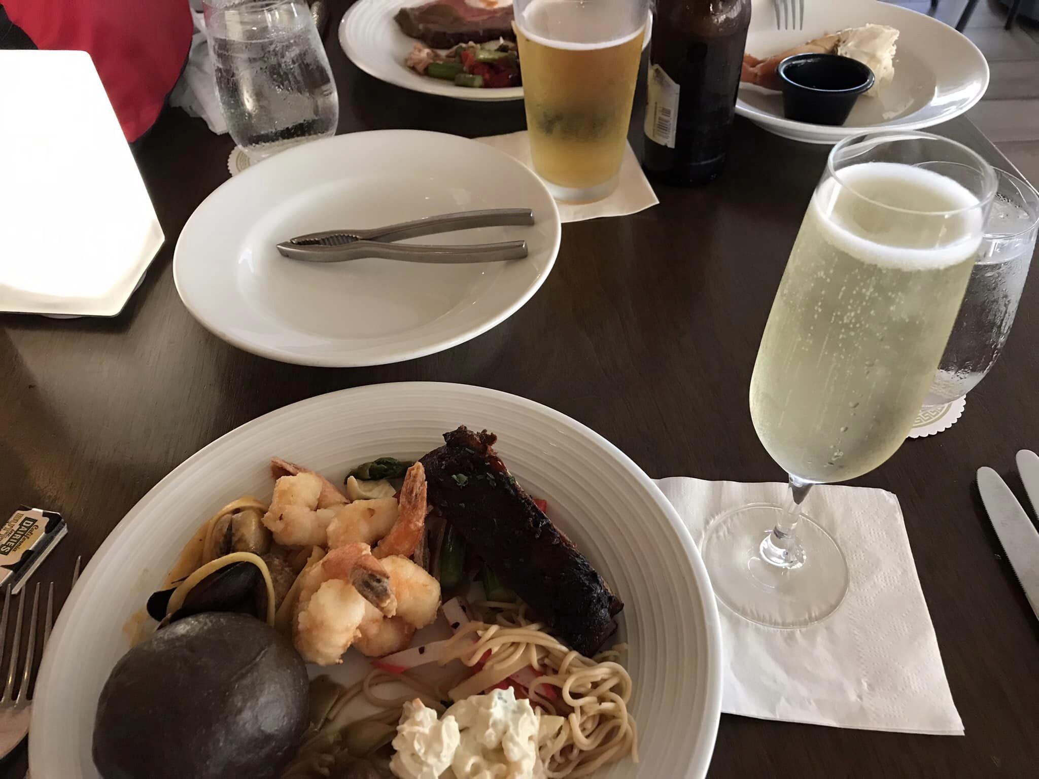 2皿めは、最初に大勢並んでいて諦めたもの。カニ、お刺身、ボイルエビ、プライムリブ、牡蠣など。