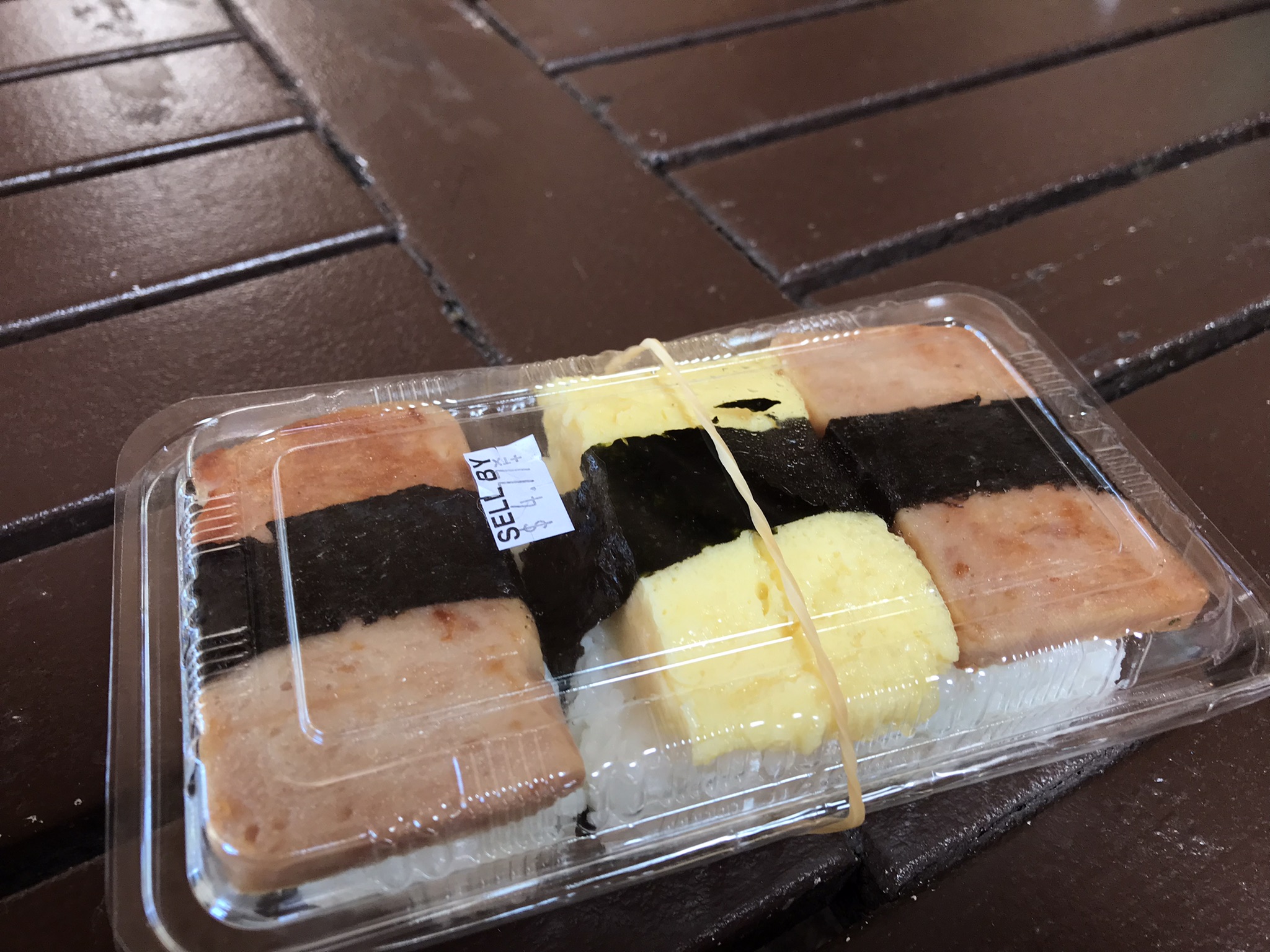今夜もディナーブッフェなので、昼は控えめにドンキホーテ前のお店が並んでいるところで軽~くランチ。スパムむすび、三個入って日本円で600円くらい。夫と二人で分け合って食べました。