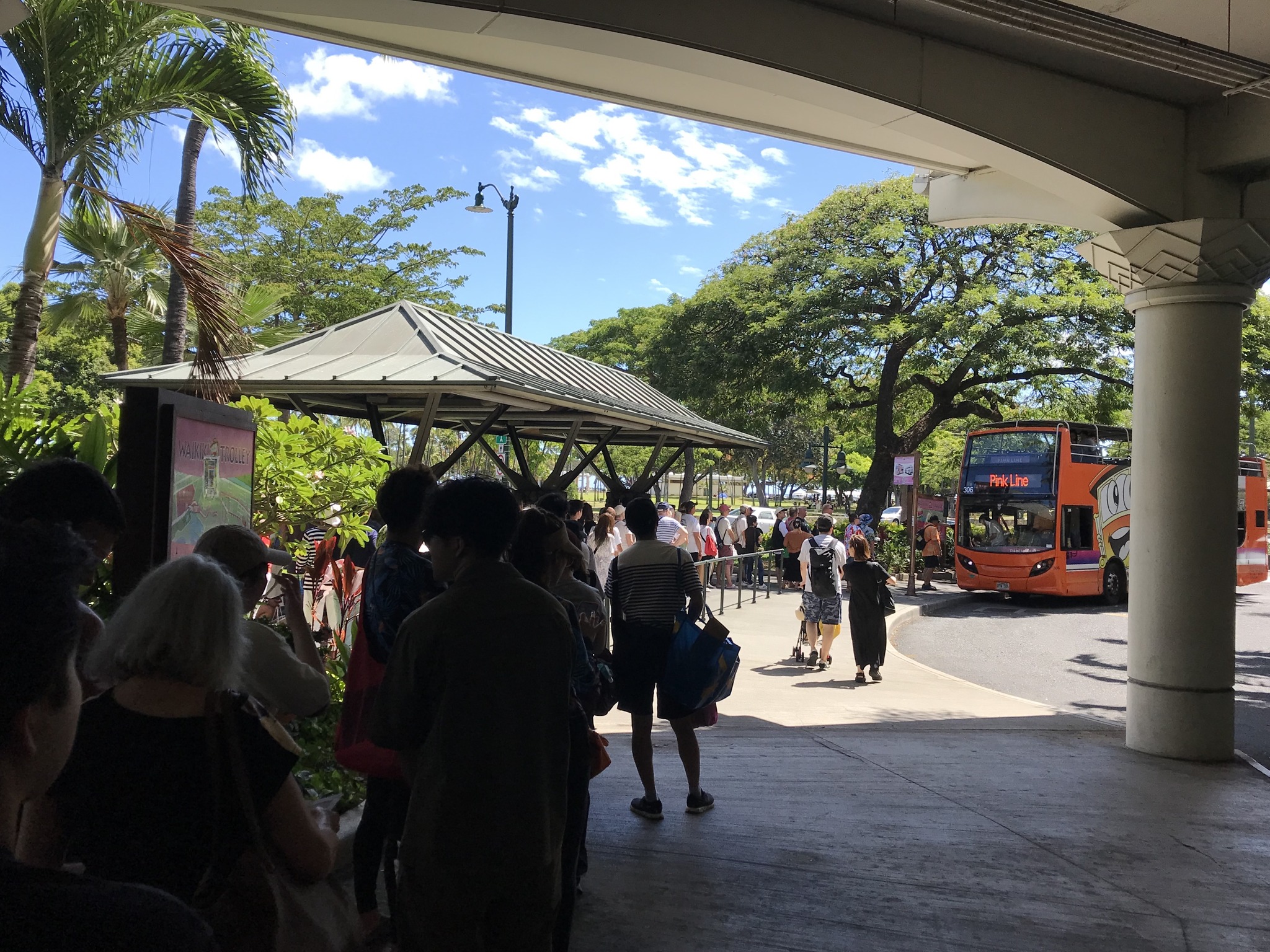帰路。アラモアナからワイキキ方面へのトロリーバス、ワイキキトロリーのピンクライン(二階建てバス)はJCBカードを見せれば誰でも無料で乗れます。しかし、この大行列。やはり半年前に比べて観光客がぐんと増えてますね。