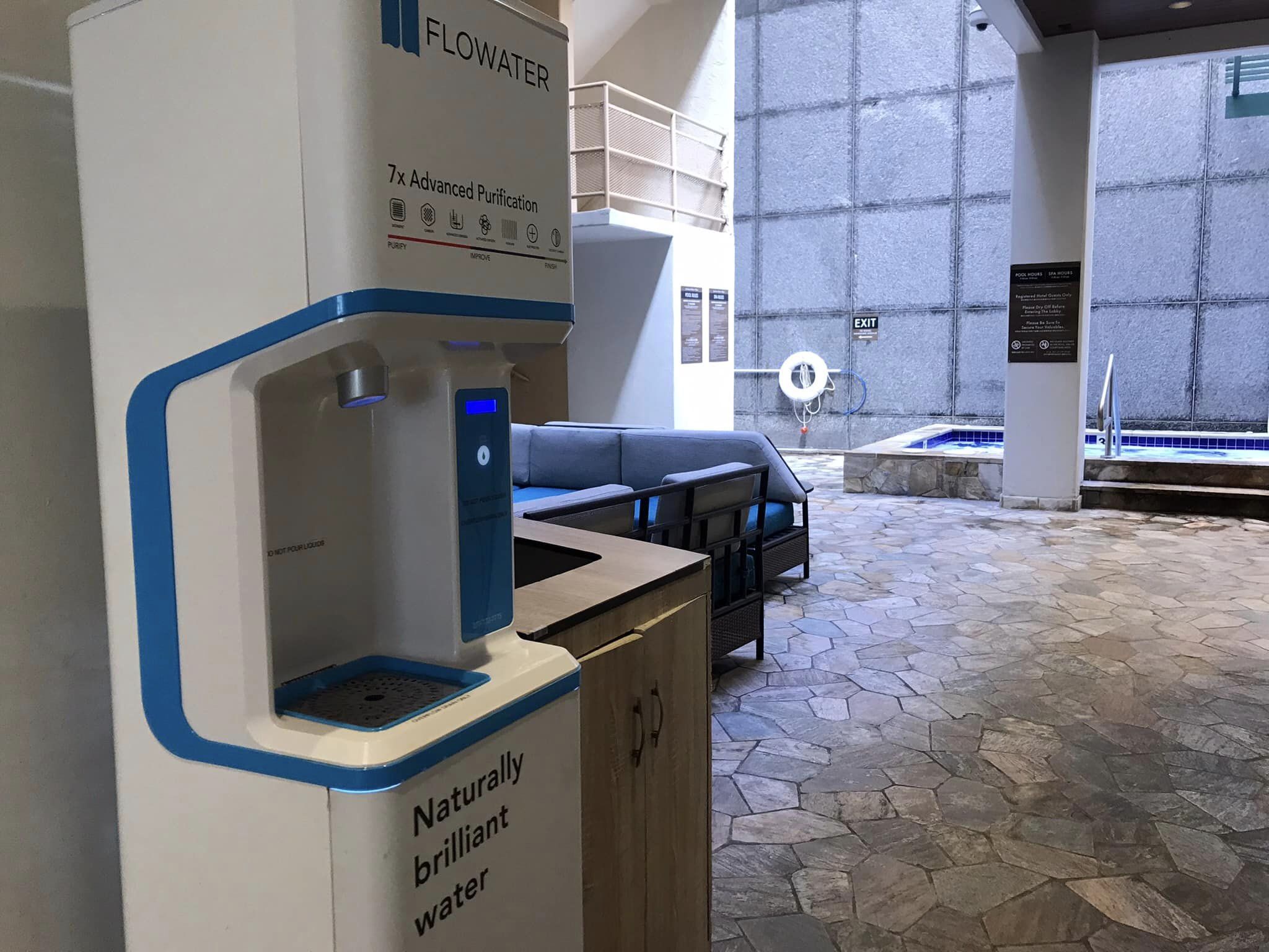 ホテルのチェックアウトを済ませ、ホテル内を記念に撮影。一度も利用しなかったプールや散々お世話になった給水機など。