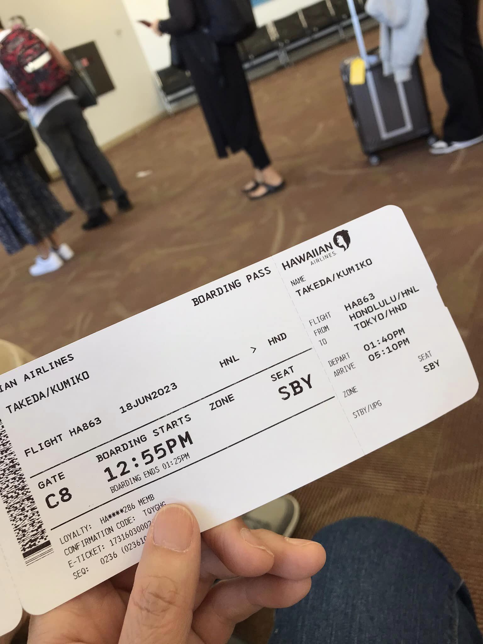 ようやくチェックインできたものの、チケットには座席番号はなく、SBYの文字。キャンセル待ちらしい。えー?乗れないかもしれないってこと?