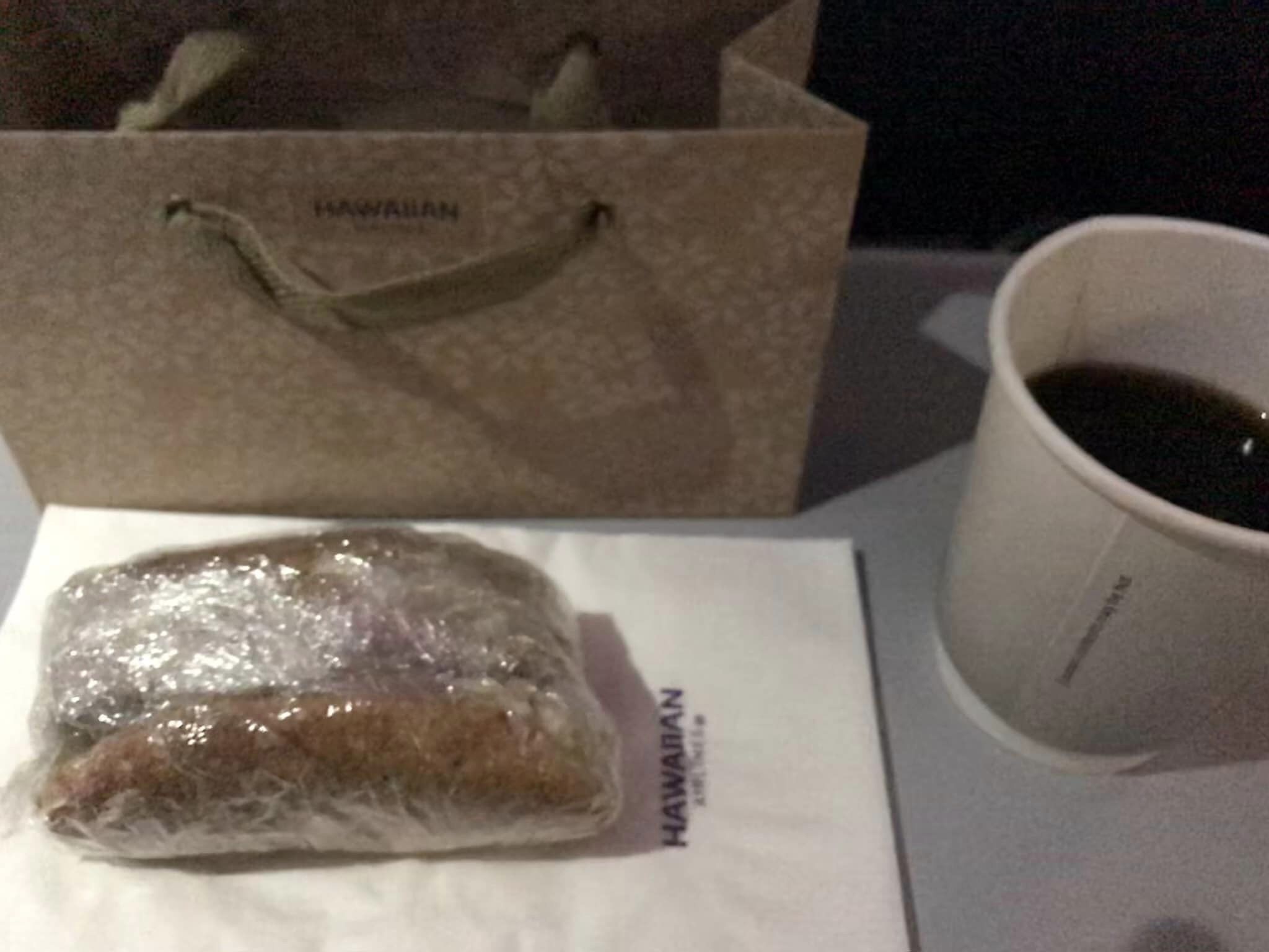 当初の出発時刻より2時間以上たって、ようやく出発。最初の機内食はハンバーグとポテトサラダ、ホノルルクッキー。ドリンクはハワイのビールをいただきました。到着前の軽食はサンドイッチ、ヨーグルト、カップケーキ、フルーツ、バランス栄養食。ドリンクはコーヒーをいただきました。